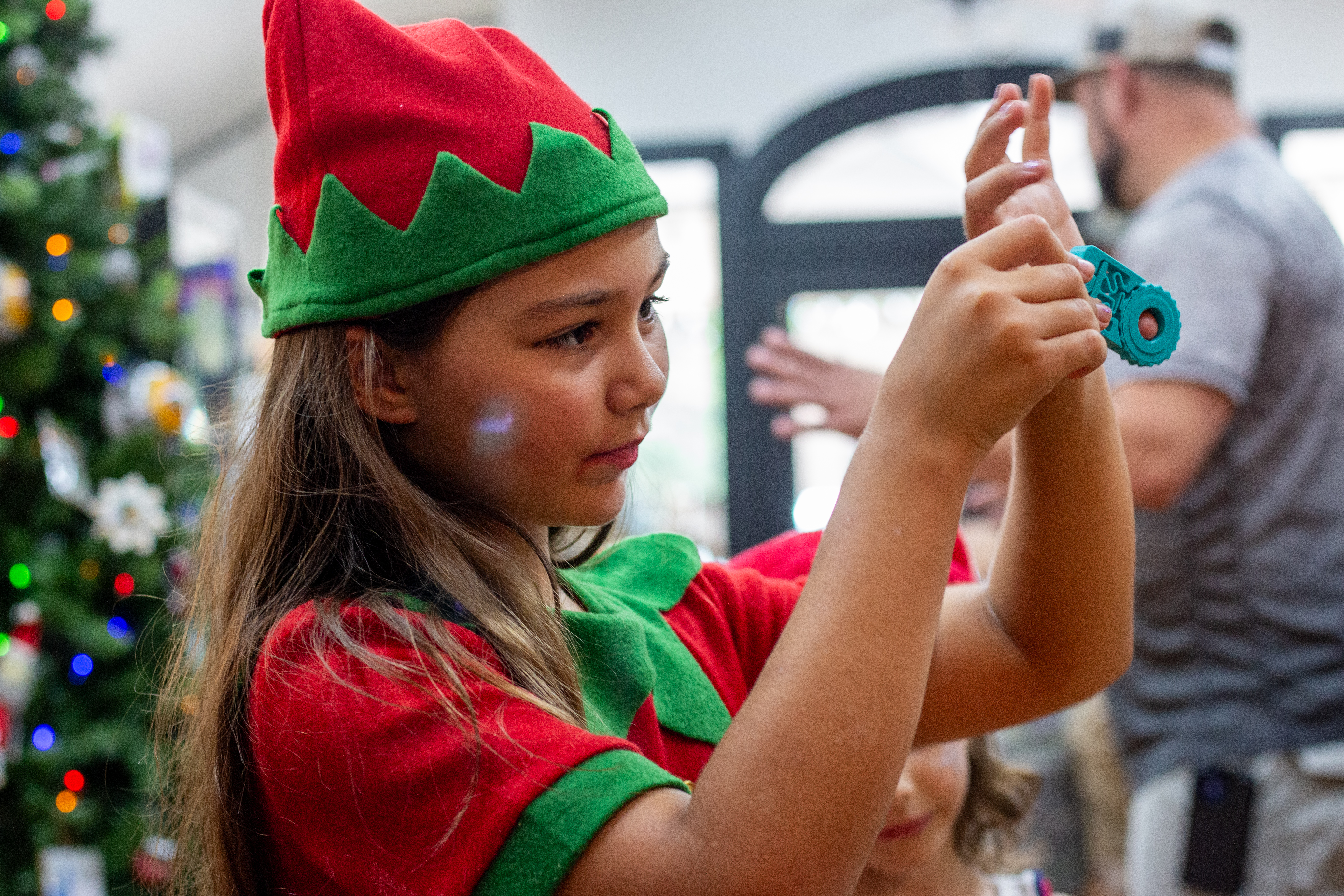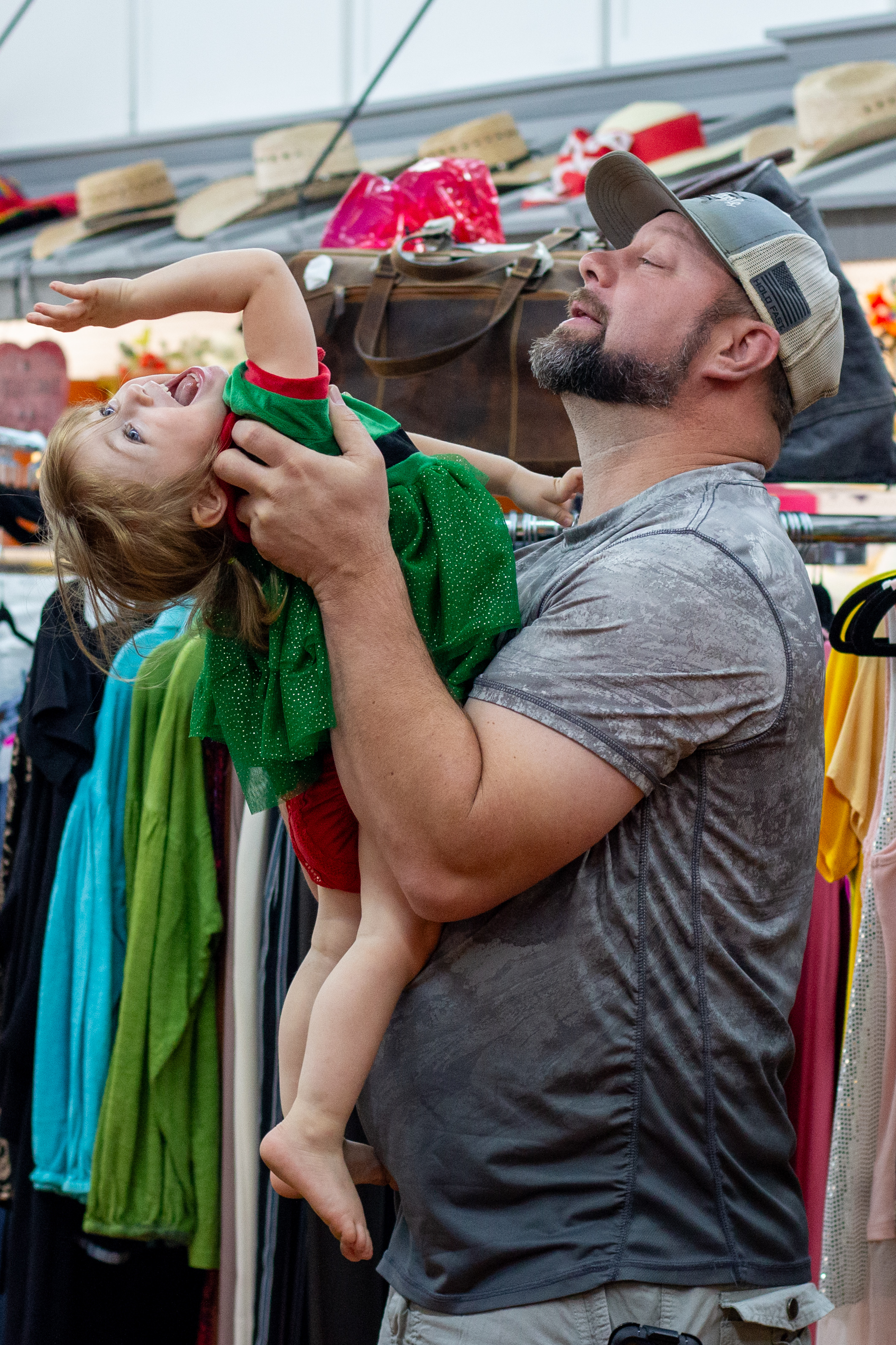 Dorthy Wiebold plays with a fidget toy during the Christmas in July Retail Crawl, Saturday, July 26, at Southern Flair on the Square.Katherine Zummallen poses with a Santa Claus for a photo for her grandmother during the Columbus Christmas in July event, Saturday, July 26, at the Santa Claus Museum.Johnnie Wiebold plays and lifts his daughter Betty Wiebold during the Christmas in July Retail Crawl, Saturday, July 26, at Southern Flair on the Square.