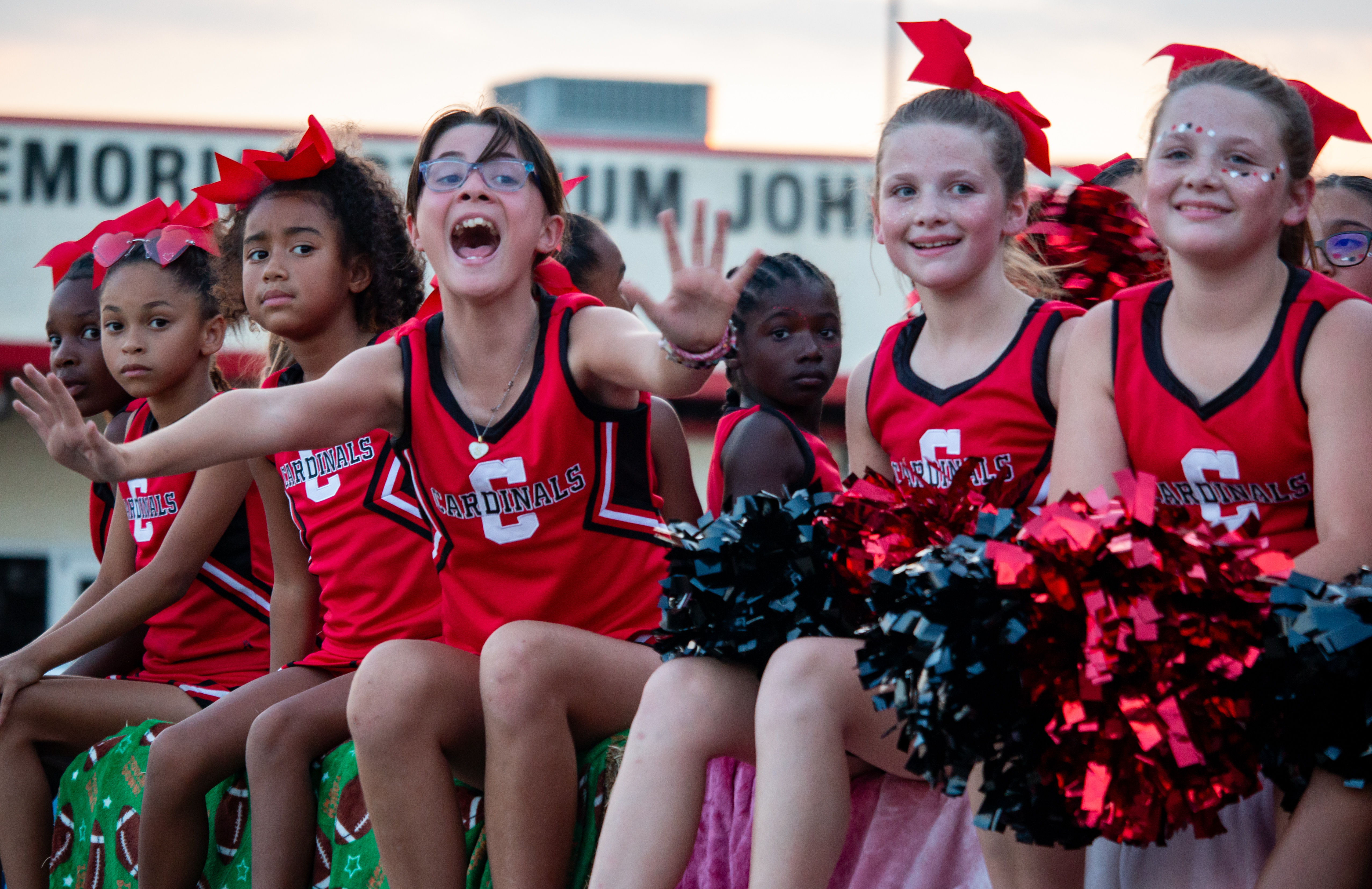 Columbus Junior High cheerleaders Harley Lewis (left), Aubrey Sosa, Rhylin Barten and Norah Wall cheer for a crowd during the Homecoming Parade, Wednesday, Oct. 1, near Memorial Stadium.