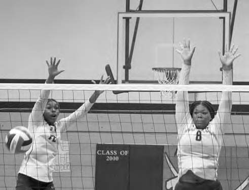 Janiyah Cooper (left) and Skylar Rhodes block a ball for a point for the Ladycats. Citizen | Evan Hale