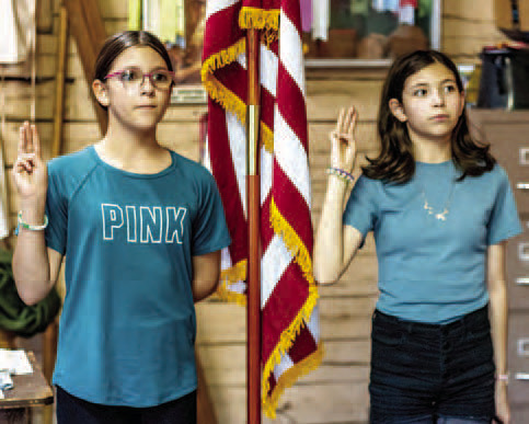 Alice Schmidt (left) and Miamor Martinez make the Girl Scout sign while reciting the Girl Scout Promise, Tuesday, Oct. 14, at the Scout Hut. Citizen | Allison Drinnon