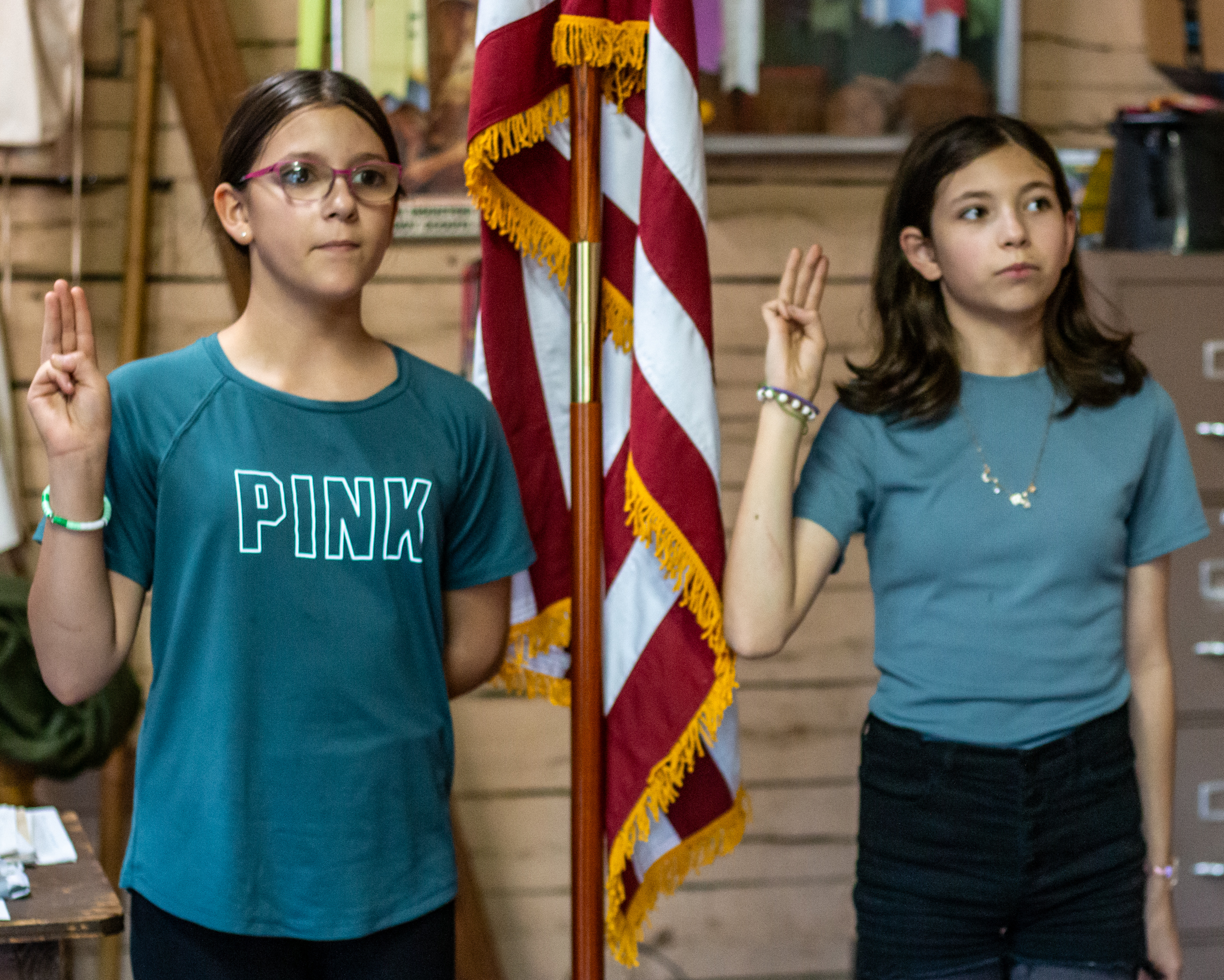Acting Chartering Scout Master George Bergfeld Sr. led Miamor Martinez and Alice Schmidt through the Girl Scout Promise and began teaching them various knots. To officially charter the prospective Troop 1312G, the group needs at least two more members to meet the minimum fivescout requirement.