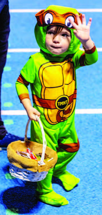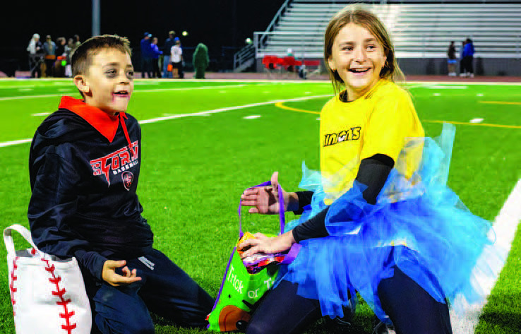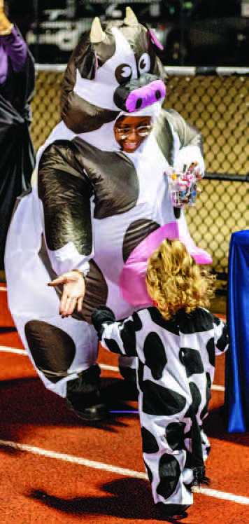 Donovan McClain waves goodbye to community members distributing candy at the end of Rice ISD’s Trick-or-Treat- Around the Track.Siblings Easton and Paisely Pesak sort through their candy on the football field after Weimar ISD’s Trick-or-Treat- Around the Track, Wednesday, Oct. 29, at Weimar Stadium.Captain Aubrey Brown with Colorado County EMS high-fives fellow cow-costumed Hallie Gayton during Columbus ISD’s Trick-or-Treat-Around the Track, Wednesday, Oct. 29, at Memorial Stadium.