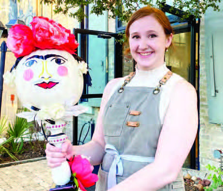 Live Oak Art Center Director Erin Story poses with a Día de Muertos-themed table centerpiece at the Oct. 30 reopening of The Courtyard Wine Bar. Photo by Alesia Woolridge