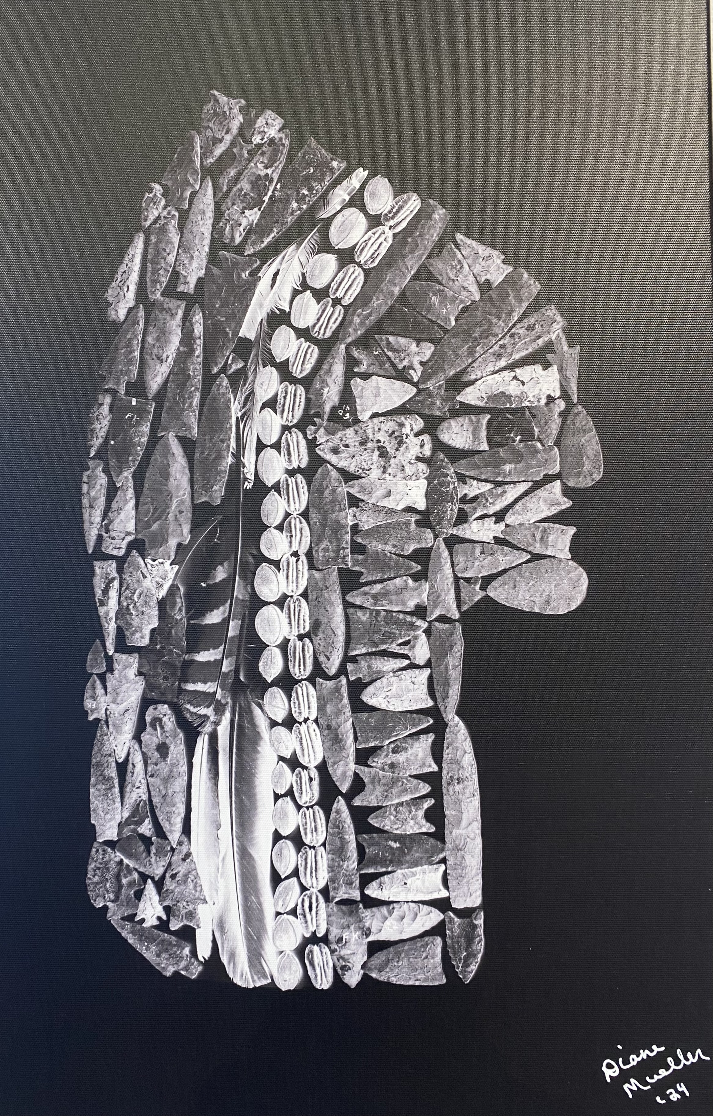 While her favorite pictures in this exhibit change, Mueller said her current favorite is a picture that she created with her father in mind. The piece includes many arrowheads made by Mueller’s father that depict a Native American with feathers and pecans.
