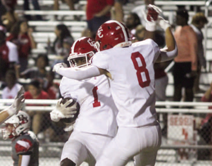 Brennan Hicks (left) and Troy Kohleffel celebrate together after scoring a touchdown.