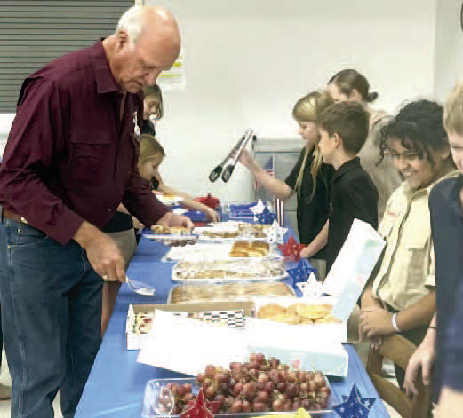SAS 6th graders offer up breakfast treats to Veteran David Wilde at the SAS Veterans’ Day breakfast.
