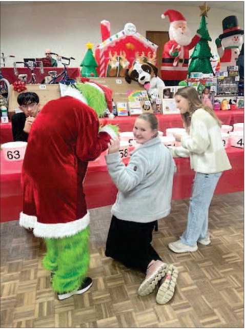Reese Kulhanek (center) and Olivia Pavlicek (right) interact with the Grinch during Columbus Elementary’s Annual Breakfast with Santa on Saturday, Dec. 6, at Columbus Hall. Photo Courtesy of Monica Heffley