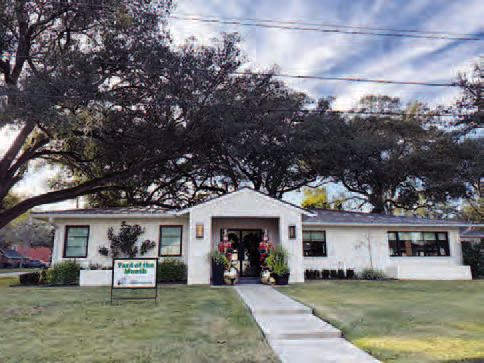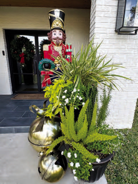 December Yard of the Month was awarded to 1636 Front St. The planting beds surrounding the sides of this corner lot home look great year-round with a reliable foundation of shrubs, grasses and small trees. Eastern redbud trees with a spectacular spring display look great all year long including their interesting structure in the winter. An espaliered magnolia provides evergreen beauty all year and interesting blooms after the redbuds fade. A diamond-patterned Belgian fence created from creeping wire vine adds architectural interest. Encore azaleas flush with color spring, summer and fall. Other hardy plants include feathery dark green Podocarpus, boxwood, azalea, variegated flax lily, and a variety of ornamental grasses that seed in the fall bringing beauty and food for the birds. In addition to the landscaping tailored well for our hot, dry summers, the homeowners decorated the front porch to greet visitors for the holidays with a pair of life-sized toy soldier nutcrackers and massive jingle bells surrounding tall glazed ceramic pots full of green-hued texture featuring flax lily, chartreuse sweet potato vine, foxtail fern, and vinca for a splash of white flowers.