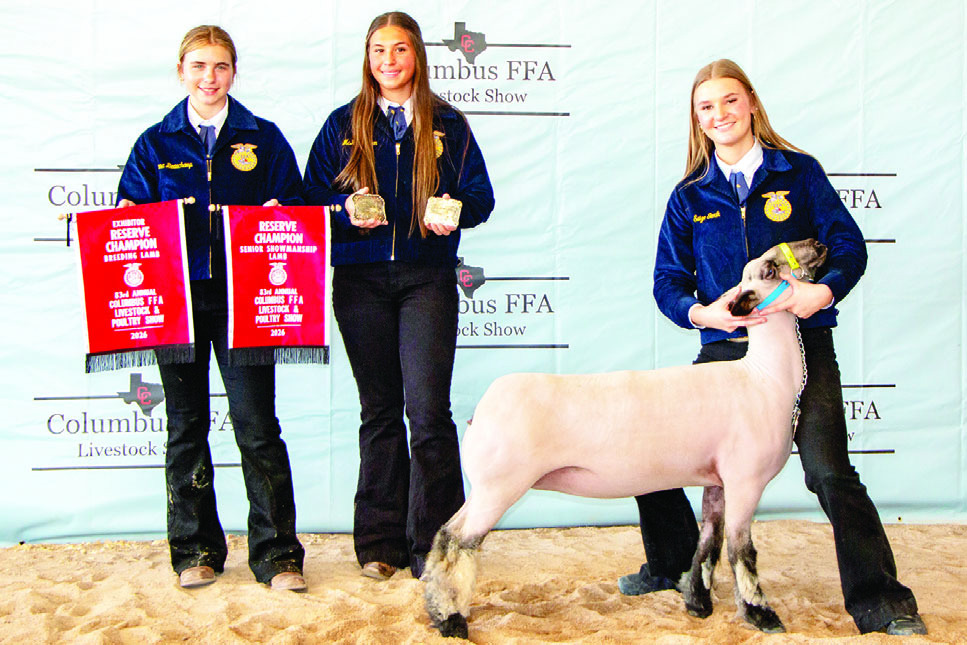BREEDING LAMB Saige Gerik, right, exhibited the Reserve Champion Breeding Lamb for no sale. On hand for the recognition were from left, Emma Beauchamp and McKenna Eden.