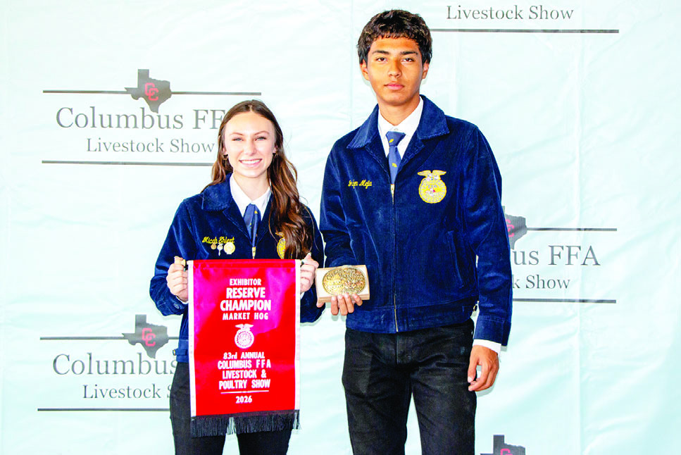 MARKET HOG Jayden Mejia, right, exhibited the Reserve Champion Market Hog for no sale. On hand for the recognition was Miss FFA Micah Ehlert.