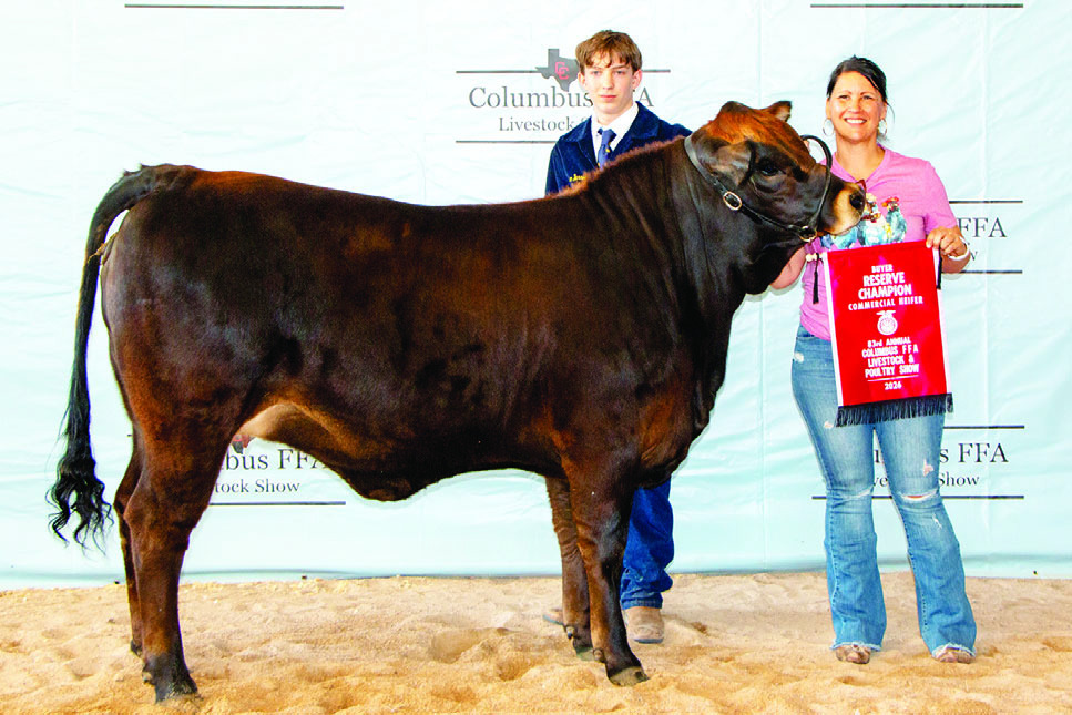 COMMERCIAL HEIFER Graison Burris exhibited the Reserve Champion Commercial Heifer, purchased for $5,999 by Schneider Hall. On hand for the recognition was buyer Amber Becerra.