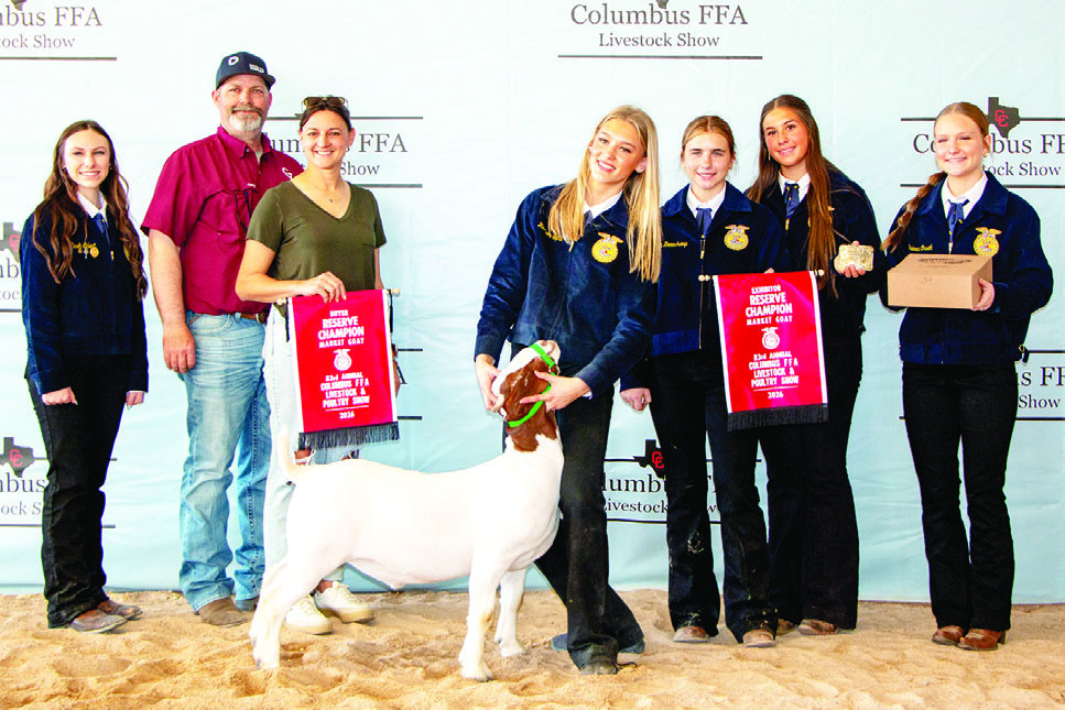 MARKET GOAT Harper Gerik, front, exhibited the Reserve Champion Market Goat, purchased for $3,000 by Glueck Tree Farm. On hand for the recognition were, from left, Miss FFA Micah Ehlert, buyers Jeff and Erin Glueck, Emma Beauchamp, McKenna Eden and Lanie Orsak.