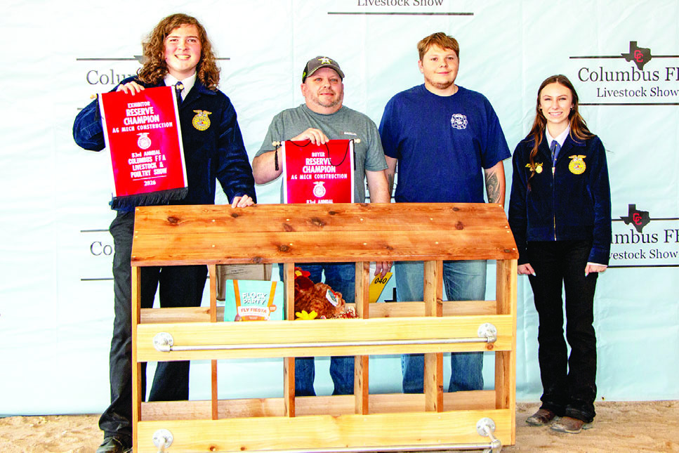 AG MECHANICS CONSTRUCTION Joshua Newman, left, exhibited the Reserve Champion Ag Mechanics Construction, purchased for $1,400 by Roy Rogers. On hand for the recognition were, beginning second from left, buyers Roy and Justin Rogers and Miss FFA Micah Ehlert.