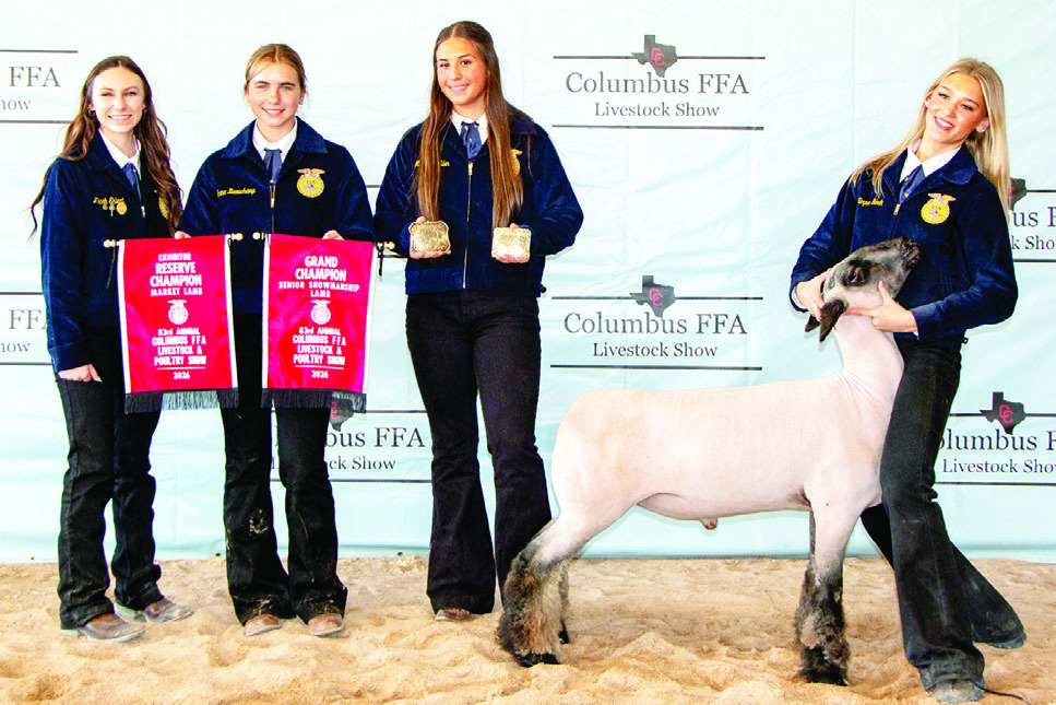MARKET LAMB Harper Gerik, right, exhibited the Reserve Champion Market Lamb for no sale. On hand for the recognition were from left, Miss FFA Micah Ehlert, Emma Beauchamp and McKenna Eden.