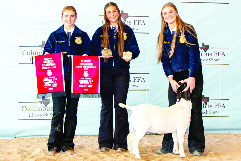 BREEDING GOAT Saige Gerik, right, exhibited the Reserve Champion Breeding Goat for no sale. On hand for the recognition were, from left, Emma Beauchamp and McKenna Eden.