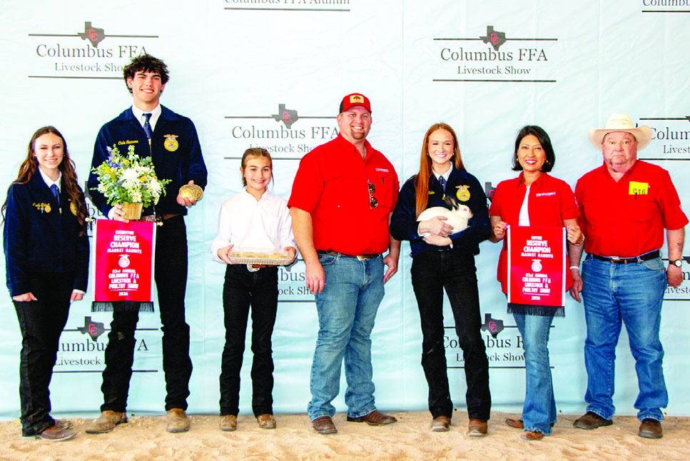 FRYER RABBITS Kyndal Kuhn, fifth from left, exhibited the Reserve Champion Fryer Rabbits, purchased for $2,350 by Columbus State Bank. On hand for the recognition were, from left, Miss FFA Micah Ehlert, Cade Neuman, Kennedy Kuhn, Evan Venghaus, Kyndal Kuhn, Christy Alonso and Charlie Bittner.