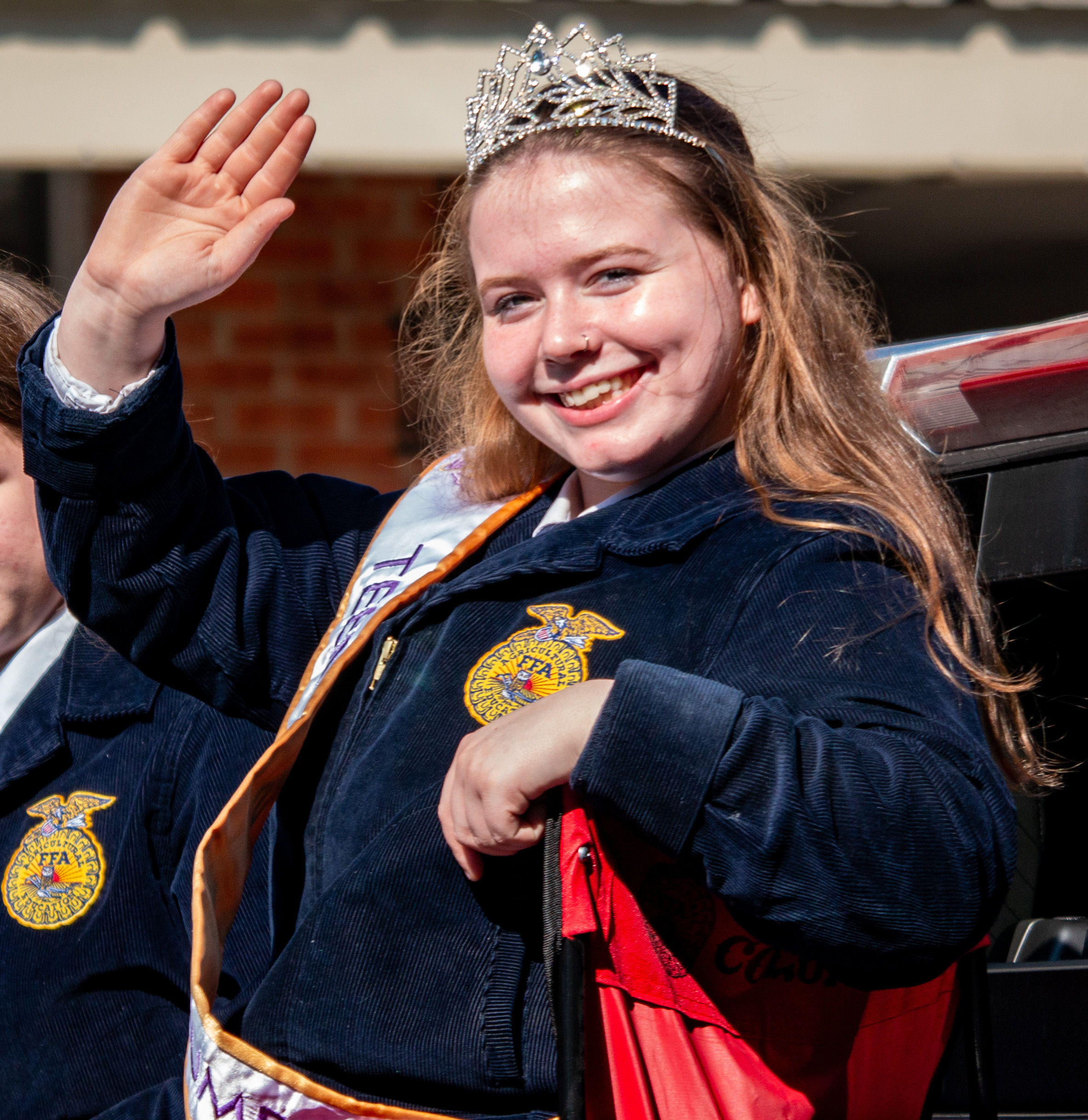 Columbus FFA Reporter Mylee Moffett waves alongside other CFFA Chapter Officers from the back of a pickup truck during the Columbus FFA Parade, Saturday, Feb. 28, in downtown Columbus.