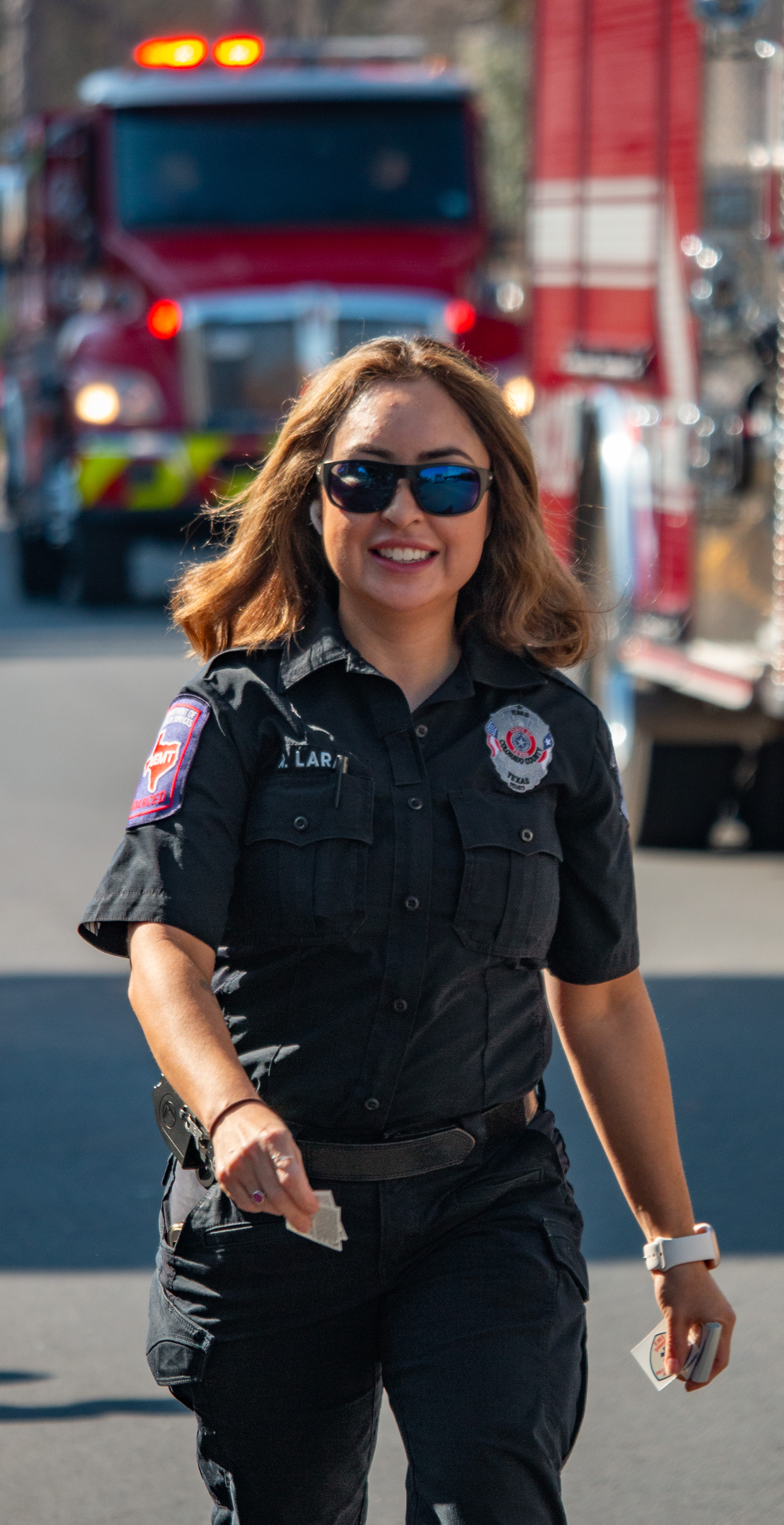 Angela Lara, an advanced emergency medical technician with Colorado County EMS, walks alongside fire engines and an ambulance to hand out stickers during the Columbus FFA Parade, Saturday, Feb. 28, in downtown Columbus.