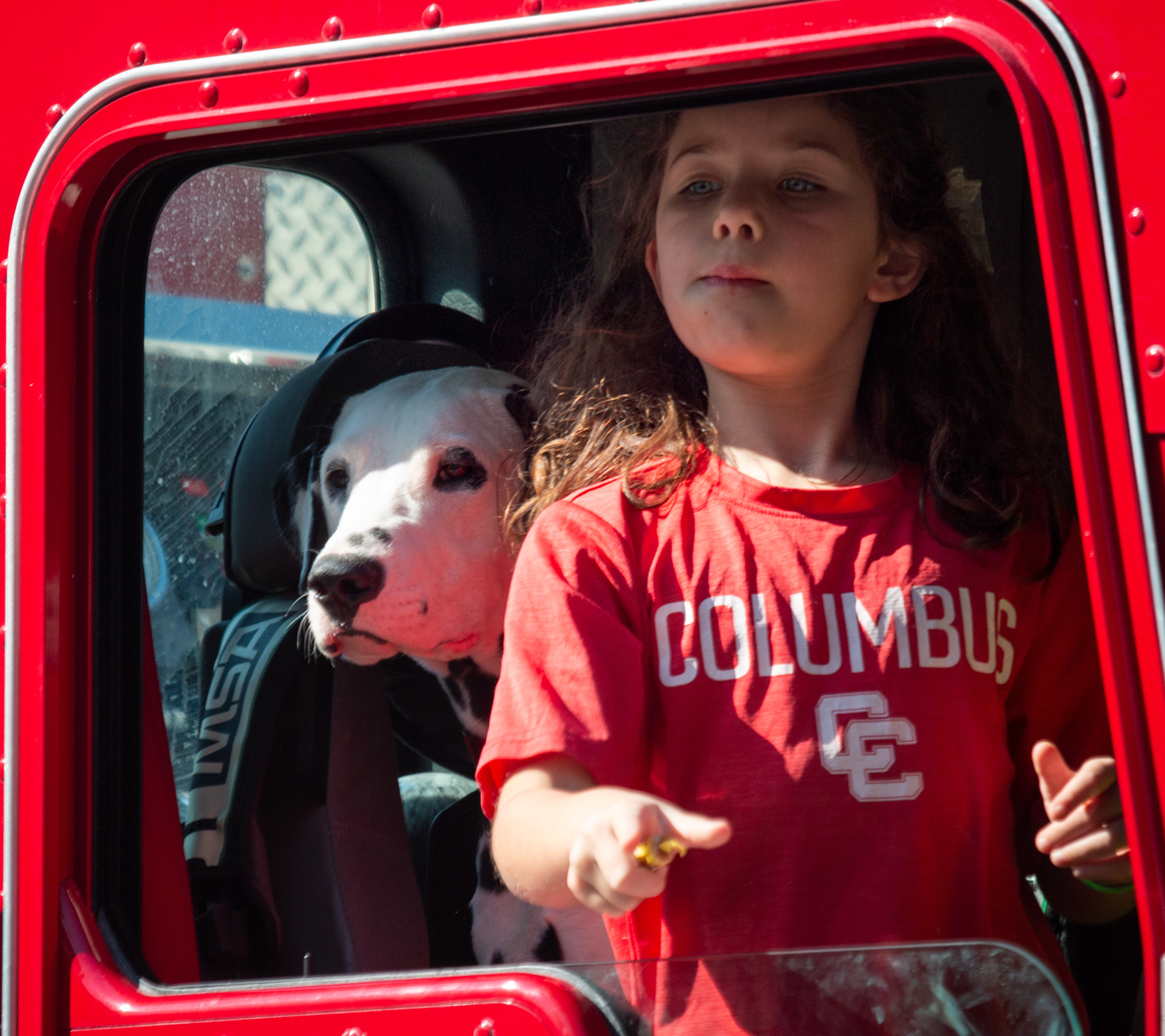 Sloane Davis tosses candy to parade watchers alongside dalmatian dog Major in a Frelsburg Volunteer Fire Department fire engine during the Columbus FFA Parade, Saturday, Feb. 28, in downtown Columbus.