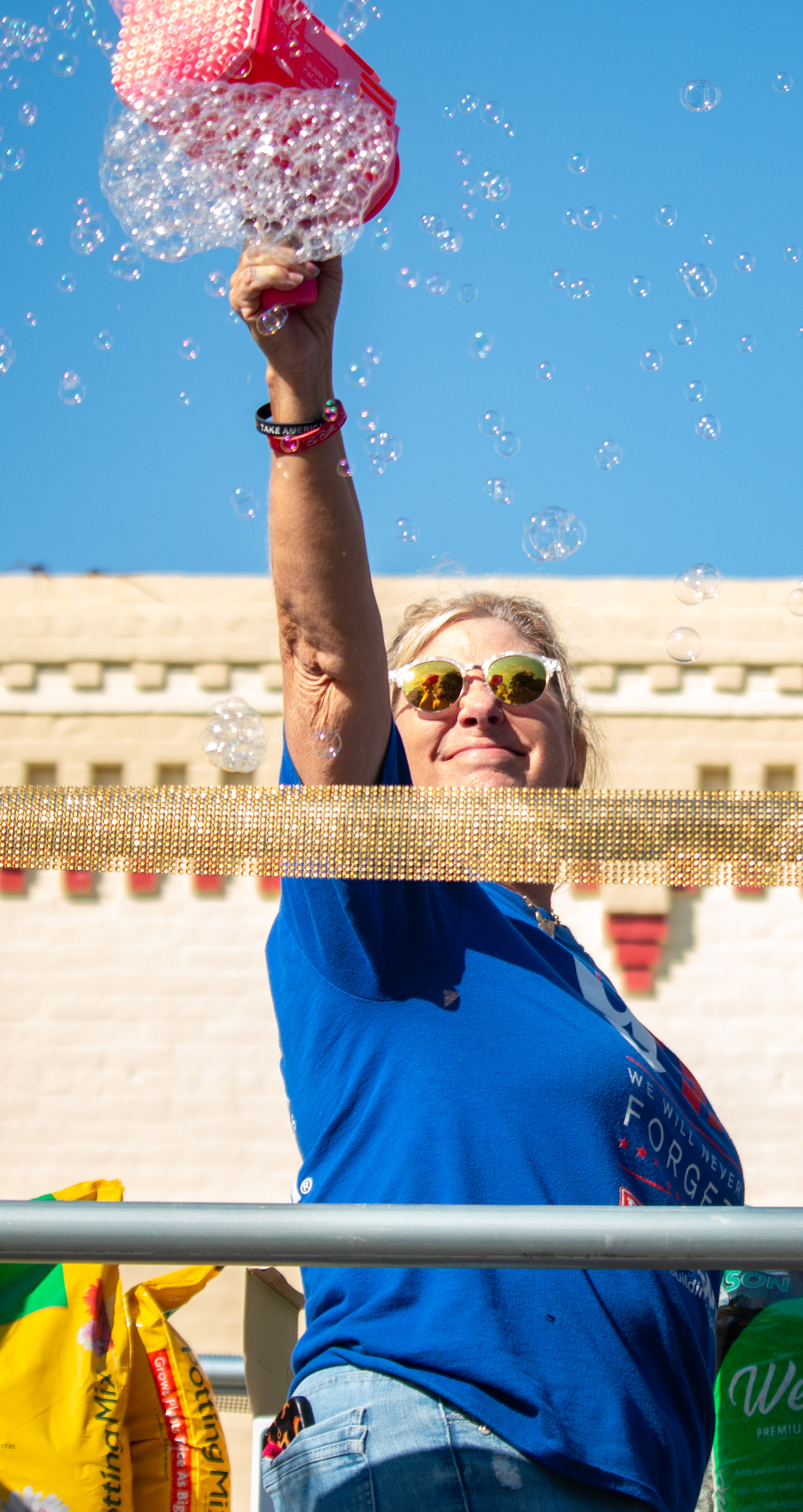 Wendy Haley waves a bubble maker on the AL&M Building Supply float during the Columbus FFA Parade, Saturday, Feb. 28, in downtown Columbus.