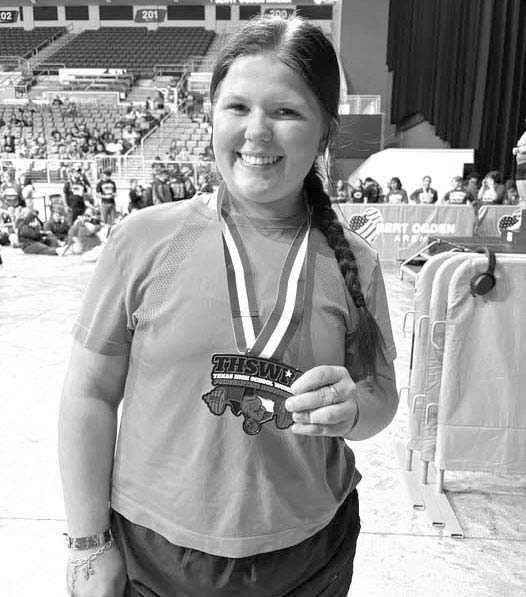The Weimar Ladycats Powerlifting team competed in the Regional Powerlifting Meet and came home with a 5th place finisher. Kaylee Christen came home with a medal for coming in fifth place at the Regional Powerlifting Meet. She squatted 295 pounds, bench pressed 180 pounds and dead lifted 260 pounds for a total of 735 pounds to come in fifth place.
