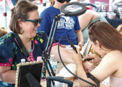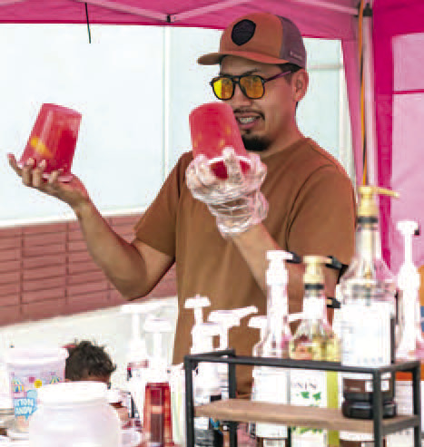 All Photos by The Citizen | Allison DrinnonABOVE: Cristine Etue smiles and laughs while chatting with permanent jeweler Emily Ponder during Rock the Block, Friday, March 27, in downtown Weimar. All Photos by The Citizen | Allison Drinnon:Hilario Berrones mixes two freshly squeezed lemonades during Rock the Block, Friday, March 27, in downtown Weimar.